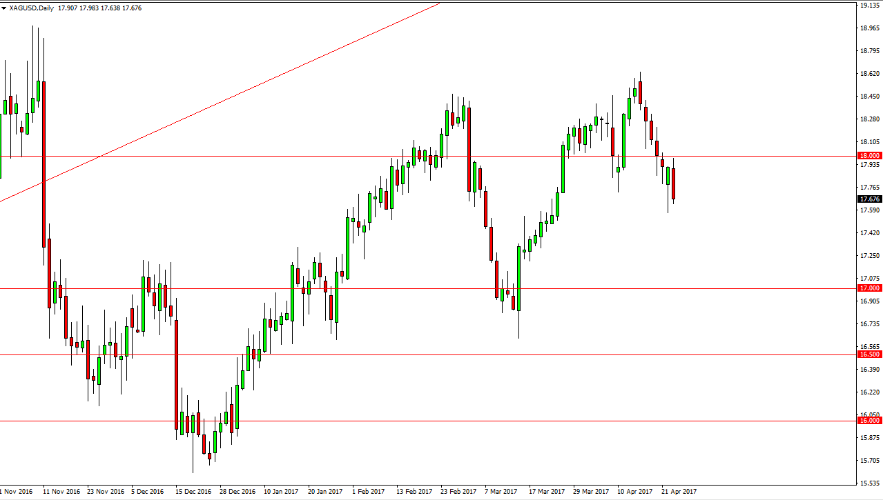 Silver markets initially tried to rally on Tuesday but found the $18 level to be a bit too resistive. By turning around and falling the way they did, it suggests that we are going to continue to grind lower. I think that there is a significant amount of support to be found at the $17.50 level, so I would expect that a bounce could be coming. However, I also recognize that we could drift all the way down to the $17 level and stay within the overall consolidation that we have seen recently. Expect volatility, this is probably a market that it’s going to be a bit difficult.