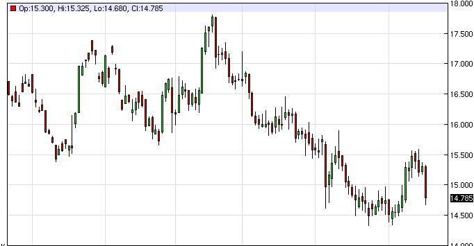 Silver markets fell during the course of the session on Tuesday, slicing through the $15 level. Because of this, the market looks like it is going to continue falling overall, and we believe that it’s only a matter of time before the rallies fail. In other words, we are simply going to sell rallies the show signs of weakness. We believe that the market is going to head down to the $14.50 level, which has been so massively supportive. Ultimately though, with the one thing that we can count on is volatility, as the silver markets tend to be very volatile anyway.