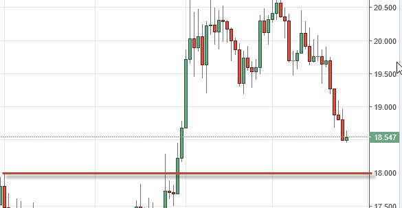 Silver markets tried to rally during the course of the session on Thursday, but turned right back around and formed a bit of a shooting star. I believe we are going to continue to drift lower, but I also recognize that the $18 level below should be massively supportive as it was a significant resistance barrier previously. However, we will more than likely have quite a bit of volatility, so you have to be willing to sit through that. I do believe that silver goes higher over the longer term though, so any short position that I would put on right now would be short-term at best.