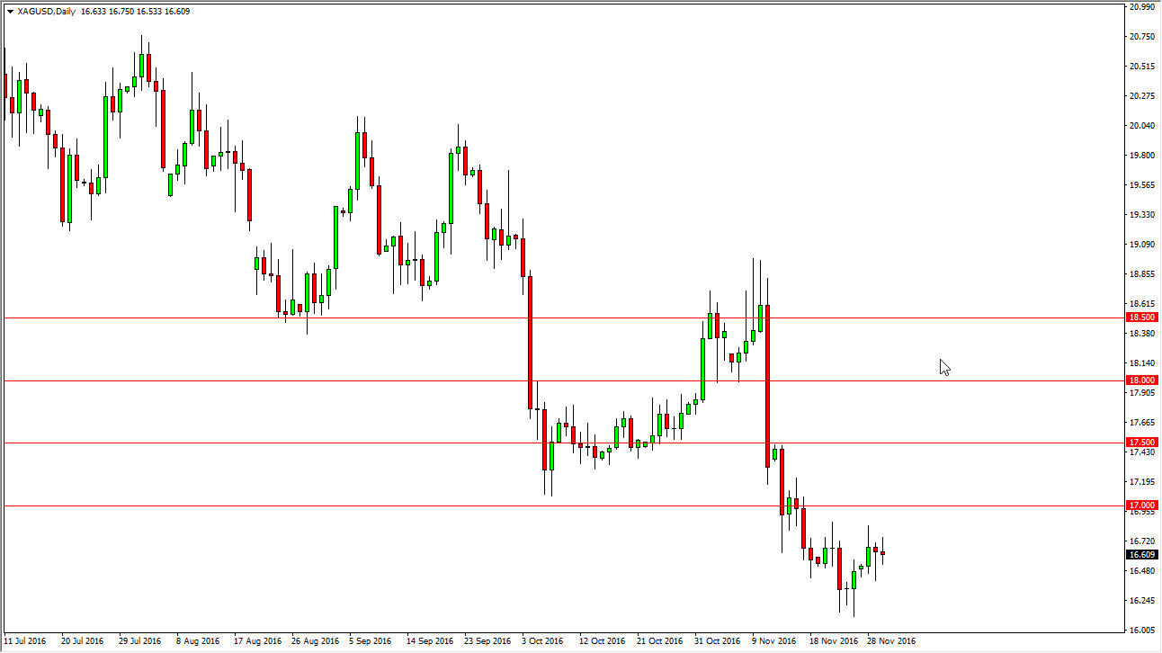 Silver markets had a very quiet Wednesday, hovering just above the $16.60 level most of the day. At the moment, it appears that we are a bit exhausted from the recent choppiness but I would still venture to say that there is a lot of bearish pressure on this market. After all, the US dollar continues to strengthen so sooner or later the sellers should return. Feel that the market is going to reach towards the $16 level again, and that $17 is essentially a “ceiling” currently. With this I remain bearish.