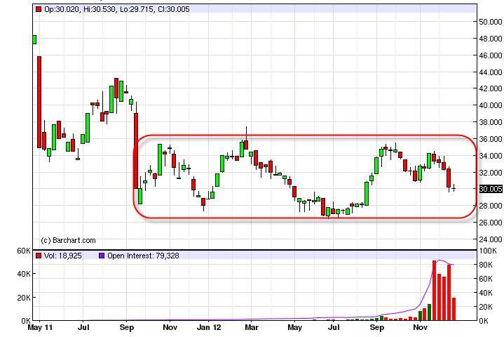 With this being said though, you can easily see that there is a nice consolidated rectangle between $26.00 and $36.00. We are closer to the bottom than the top; however we feel that the support from the gap is probably what we will be paying more attention to than anything else. Below the current prices, there is a significant amount of support all the way down to $26.00, and because of this we are not willing to short just yet as we have a longer-term upside bias to this market anyways.