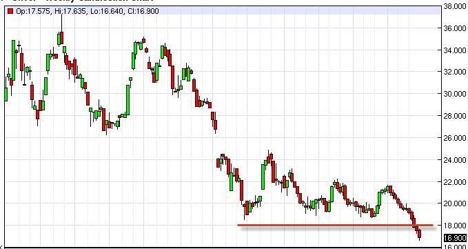 The silver markets fell during the course of the week, breaking well below the hammer that had formed during the previous week. In fact, we ended up below the $17 level during the course of the week as well, showing continuing weakness in this marketplace. We ultimately believe that this market will head down to the $15 level, and then possibly down to the $12 level after that. We will sell rallies as they continue, and as a result we have no interest whatsoever in buying this contract going forward.
