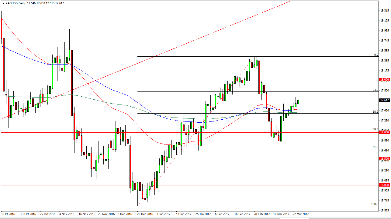 Silver markets rallied during the day on Friday, breaking above the top of the shooting star from the previous session. This of course is a bullish sign and I believe that the next area of contention will be closer to the $18 level. The major moving averages have crossed just below although they are flat. Nonetheless, I would anticipate that they offer a certain amount of support. I believe Silver is going higher, so therefore I look at pullbacks as potential buying opportunities in a market that has quite a bit of strength underneath it.