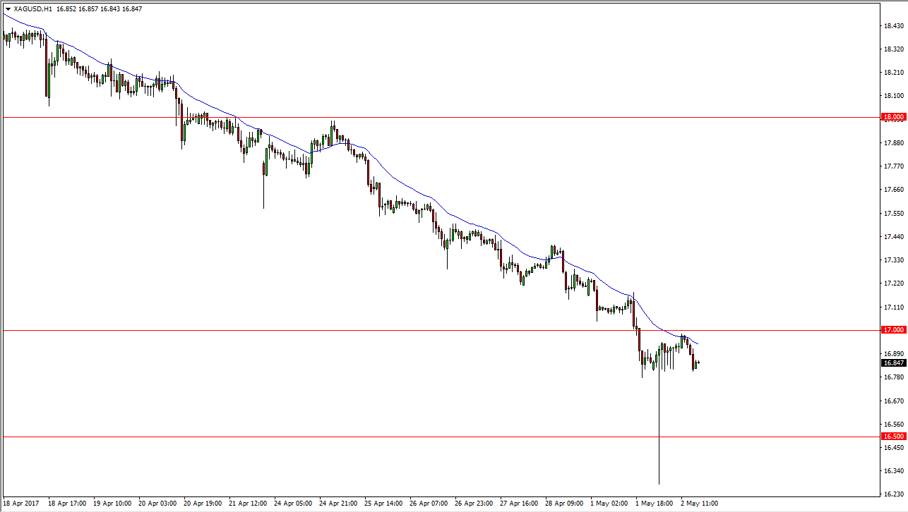 The Silver markets continue to grind sideways during the Tuesday session, below the psychologically important $17 level. This is an area that of course attracts a lot of attention, and the $16.75 level underneath seems to be supportive. However, there are a lot of issues surrounding precious metals overall, and it makes quite a bit of sense that the geopolitical risks continue to take center stage. The 24-hour moving average has been very reliable as of late, and it appears if it continues to point in a general downward movement, it’s likely that we will see sellers. Nonetheless, I do see an opportunity to go long if a couple of things happen.