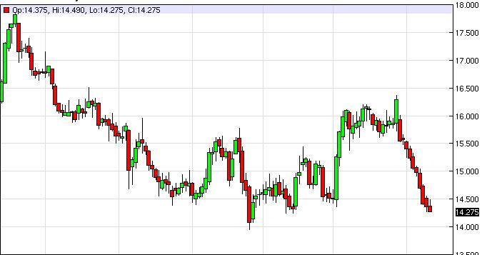 Silver markets initially tried to rally during the day on Wednesday but found the $14.50 level to be a bit too resistive and we turned back around to form a shooting star as a result. We are towards the bottom of the overall trading range, and it now looks like $14 will be tested. Can break down below there sends this market into unfamiliar territory, albeit bearish territory. We believe that rallies at this point in time should continue to be sold, as soon as we see signs of exhaustion on short-term charts.