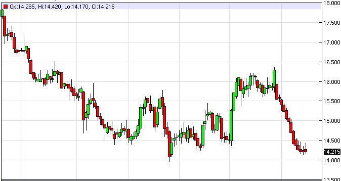 Silver markets initially tried to rally at the open on Monday, but struggled at the $14.50 level to end up falling and form a shooting star again. Ultimately, that means that the market is trying to break down below the support that has been holding it off recently. If we can break down below the $14 level, silver markets will really could fall apart. A break above the $14.50 level would be rather strong though, and we would have to start thinking about buying at that point. At this moment though, silver looks like it’s in serious trouble.