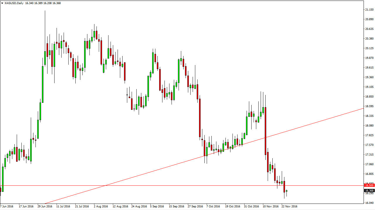 Silver markets when back and forth during the day on Thursday, but you have to keep in mind that it was Thanksgiving Day in the United States, so liquidity would’ve been an issue. Because of this, I don’t read too much into the candle and recognize that we have broken down. Any rally at this point in time will look suspicious, and I believe the sellers will get involved. The gold markets have already broken down, and typically Silver will follow its lead. With this, I believe that the US dollar strengthening continues to work against the value of precious metals.