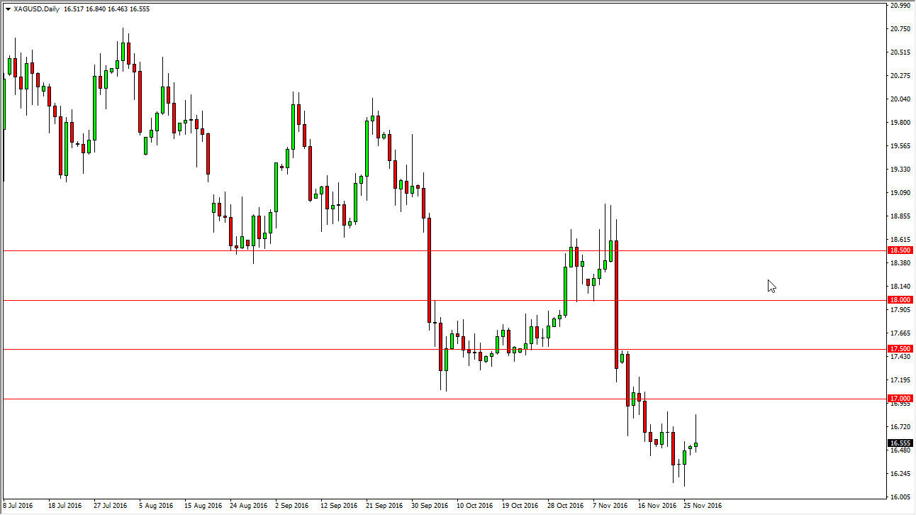 The silver markets initially rallied on Monday, but turned around to form a very resistive looking shooting star. Ultimately, this is a market that will continue to face headwinds above, and I believe that the $17 level will be a bit of a ceiling at the moment. Keep in mind that the United States dollar continues to strengthen and that of course works against the value of precious metals in general, and of course extends to the silver markets. I believe that we are going to reach towards the $16 level again, and an attempt to break down.
