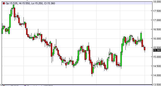 The silver markets fell slightly during the course of the session on Monday, as we continue to see weakness in this market. We broke below the $15.50 level, and that of course is a negative sign. However, we anticipate that there will be a bit of support at the $15.00 level, so ultimately it’s only a matter of time before the market bounces yet again. With this, we look at this market as one that can only be traded on short-term charts, as the market has so much in the way of noise in various directions. With this, we believe it’s probably best to leave this market alone.