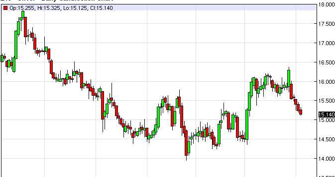 The silver market initially tried to rally during the course of the session on Wednesday, but pullback enough to form a fairly negative candle. Because of this, it looks as if the silver market is going to trying to test the $15 level, and as a result we believe that this market can be sold. On the other hand, any rally at this point in time should be a selling opportunity as well. If we can break down below the $15 level, the market should then reach towards the $14.75 handle. We have no interest in buying at the moment.