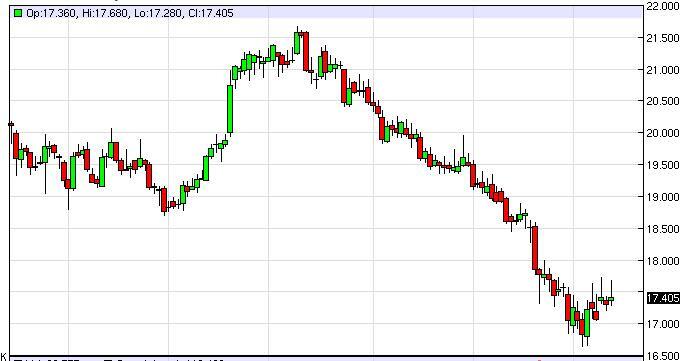 The silver markets tried to rally during the course of the day on Monday, but as you can see struggled at the $17.50 level again to form a nice-looking shooting star. Because of that, it appears the market is going to continue to go lower, and as a result we are very bearish of silver overall. Because of that, the market continues to be one that we can sell on rallies going forward, and we still believe that the longer-term downtrend will continue. In fact, we think that $15 is the next target overall.