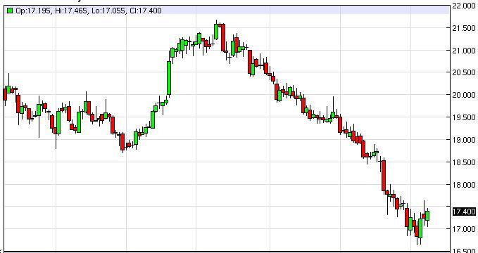 The silver markets fell initially during the session on Wednesday, but found enough support near the $17 level to turn things back around and form a positive candle. The candle is still within the shooting star from the previous day though, so it appears of the market is still going to struggle. Quite frankly, we believe that there is a significant amount of resistance at the $18 level, and between here and there we would sell any resistive candle that we see over the next several sessions. We believe the technically this market still wants to go down to the $15 level, and even though we had a nice bounce during the session on Wednesday, that has not changed in our opinion.