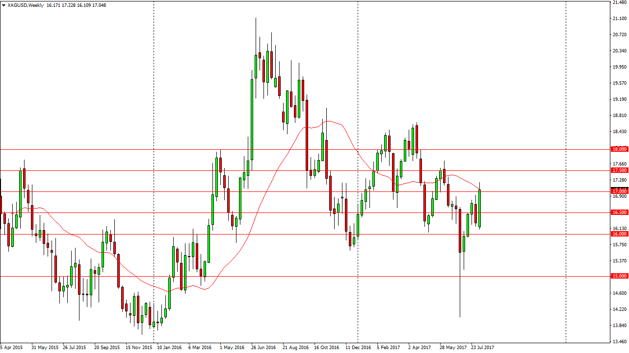 Silver markets broke higher during the week, forming a very bullish engulfing candle. While this is normally a very strong sign, I am starting to see a bit of weakness on Friday, and I think that if we break down below the $17 level, the market could very well drop from here. This has been driven by North Korean and American comments, and therefore I don’t think has any real strength. Quite frankly, the market looks likely to roll over. However, if we break above the top of the candle for the week, the next target will be $17.50, and then eventually the $18 level. All things being equal though, I’m starting to see some weakness in the gold market on Friday, and that suggests to me that perhaps we are gonna see precious metals roll over a little bit.