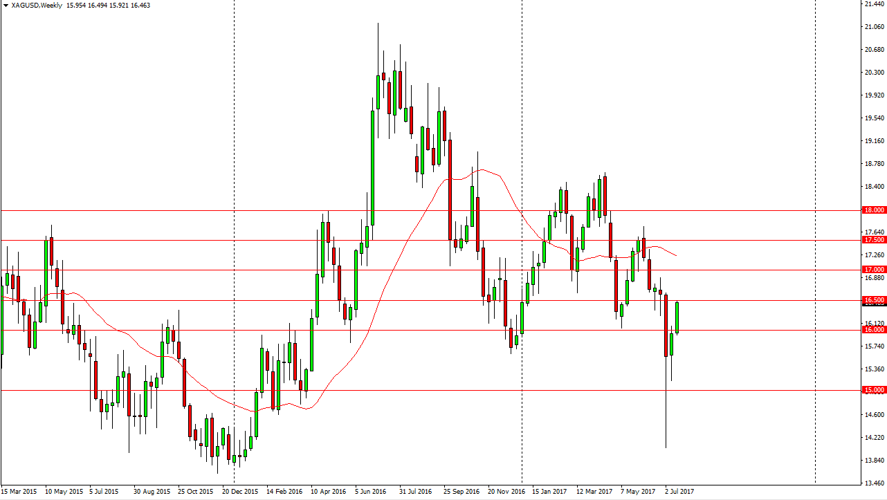 I believe that the US dollar continues to be sold off, and if that’s the case over should do quite well. I don’t like the idea of selling silver regardless, at least not from a longer-term standpoint. I would not be surprised at all to see this market go looking for the $18 level, perhaps even the $20 level over the longer term. Silver markets seem to see quite a bit of buying pressure in the area just below, so I think that traders will look at pullbacks as value just waiting to happen. If you can deal with very little leverage, the Silver markets might work out quite nicely over the longer term. Be patient though, because it looks as if we are in a consolidation zone. It is not until we break down below the $15 level that I would consider selling from the longer-term perspective, and quite frankly that does not look likely to happen anytime soon. The massive selloff that we had a couple of weeks ago has almost been completely reclaimed as of Friday.