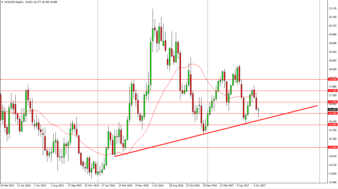 Silver markets initially tried to rally during the week but then rolled right back over to test the uptrend line just below. We ended up bouncing above the $16.50 level, which of course is a bullish sign. Even more bullish is the hammer that we formed for the weekly candle, and a break above the top of the candle should send the market towards the $17 level above, and the $17.50 level after that. Longer-term, looks as we will probably continue to find buyers in this area, as we continue to see upward pressure. I don’t have any interest in selling silver, it appears that it continues to attract money. The longer-term outlook for silver is bullish as far as I can see, but there’s obviously going to be a massive amount of volatility.