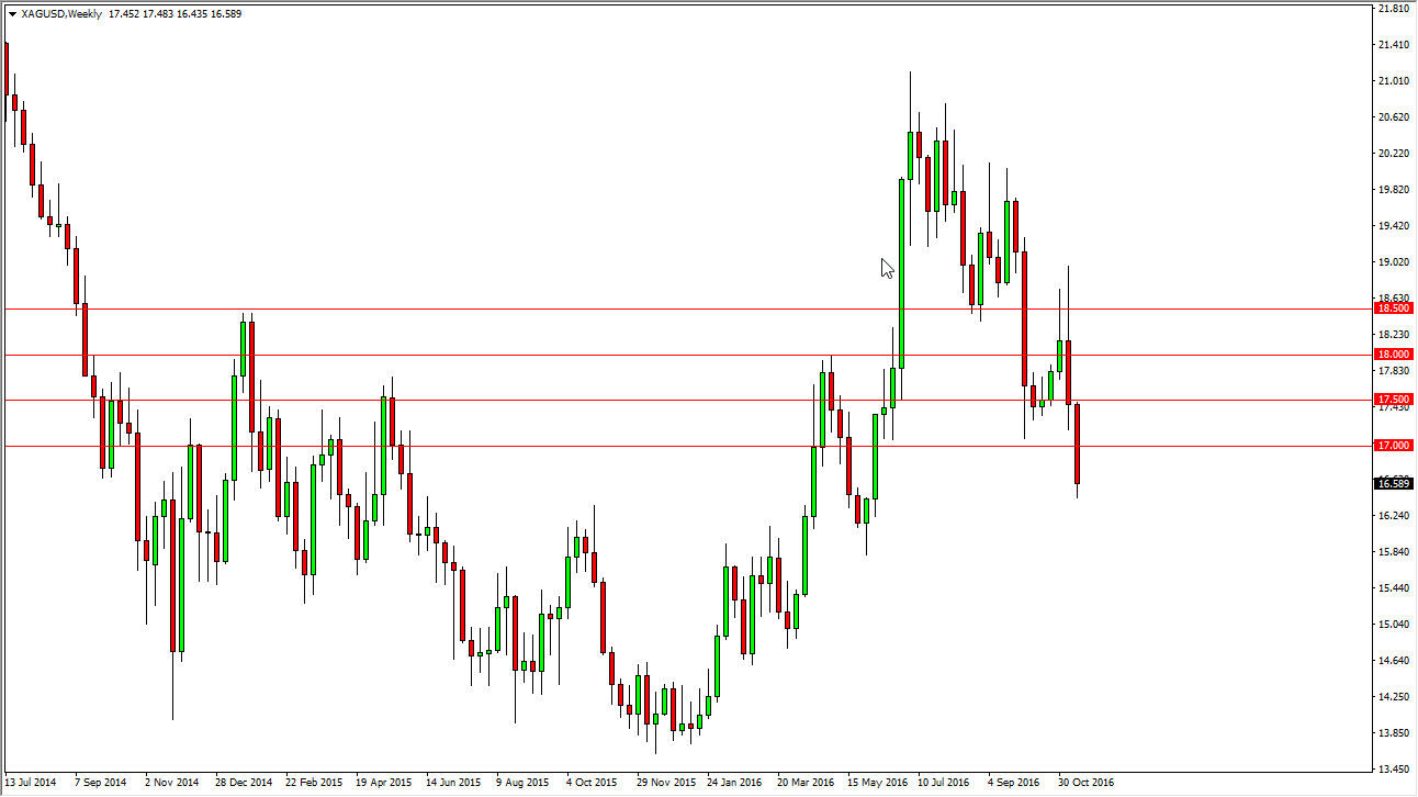 Silver markets fell rather drastically during the course of the week, slicing through the $17 level. In fact, by the end of the week we were testing the $16.50 level, so this of course is a very negative sign. It makes a lot of sense, because the US dollar has been climbing and it looks as if we will start getting interest-rate hikes. It also makes sense due to the fact that the currency markets continue to punish other currencies around the world. With this, silver should continue to go lower from here.