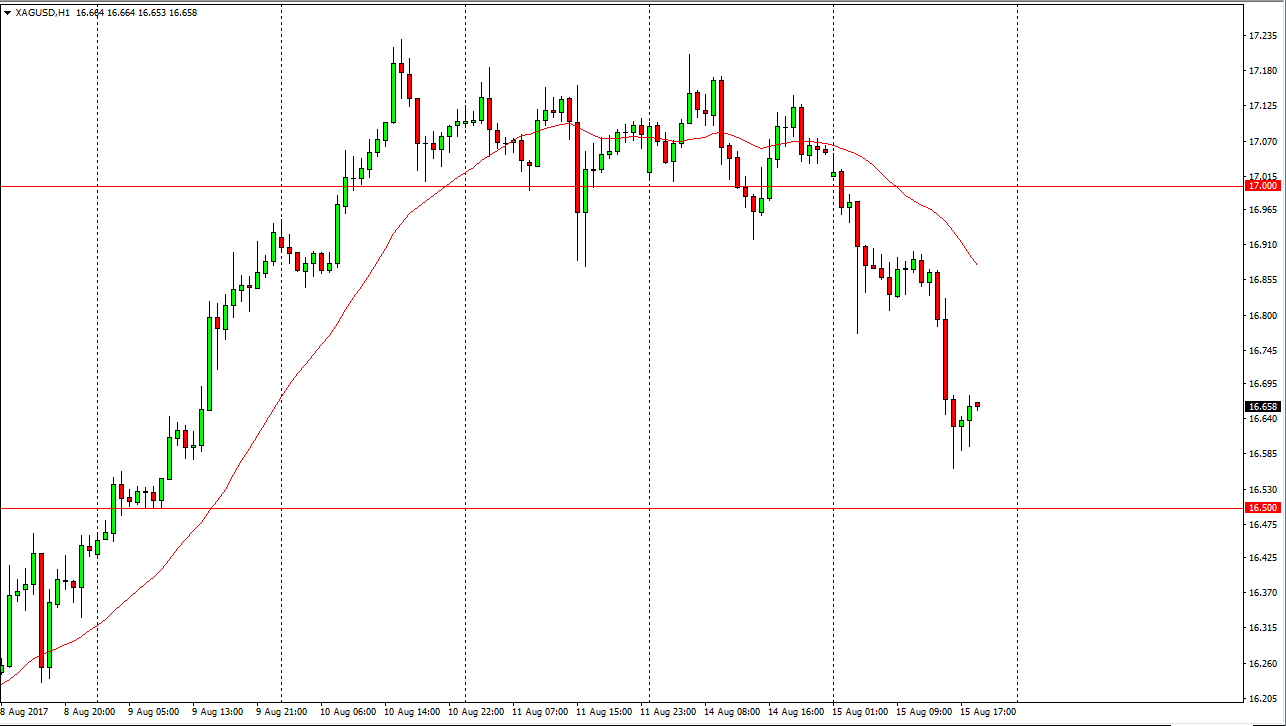 The Silver markets broke down significantly during the day on Tuesday, slicing through the $17 level. The market continues to see quite a bit of volatility, and I think that as the situation between the United States and North Korea calm down, the drive for safety will put negativity into the precious metals markets overall. The $16.50 level underneath should continue to be support though, and I think that it may take a couple of attempts to break down through it. I think that the $17 level above will continue to be resistive, and any rally between here and there that show signs of exhaustion could be a nice opportunity to start shorting the silver market yet again.