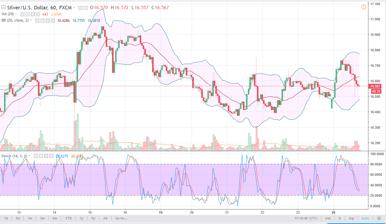 Silver markets rallied significantly after gapping lower on Monday morning, reaching towards the $16.75 level. We found resistance in that area and pulled back towards the $16.50 level. I believe that we will eventually find buyers in this market, looking to pick up even more value. I believe that the Silver markets continue to be bullish overall, but I also recognize that there is a lot of noise in the market, so I think that the market pulling back like this occasionally will be typical, and I would also recognize that it offers value. I think that the markets will eventually go looking towards the $17 level above, which of course is a large, round, psychologically significant level, and of course a structurally resistive barrier. However, I believe that longer-term the US dollar will probably continue to fall, and therefore I think that Silver will be a beneficiary of that movement.