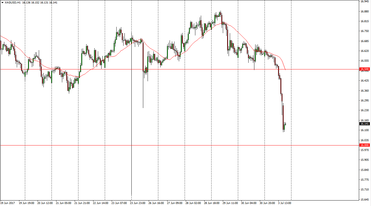 Silver markets fell slightly during the day on Monday, and then accelerated once the Americans came into play. Breaking below the $16.50 level was