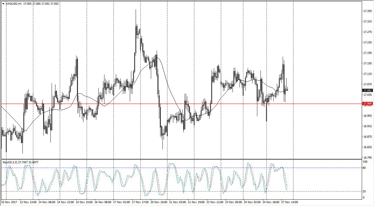Silver markets initially gapped lower at the open on Monday, but then shot straight through the $17 level yet again, reaching towards the $17.17 handle. We then pulled back significantly to test the $17 level where we found support again. The market continues to be very choppy, and I believe that the volatility in Silver will continue to be very difficult to deal with, as the US Congress continues to cause a lot of volatility due to a lack of tax reform. The $17 level is essentially “fair value”, and I think that the market will continue to be attracted to that level until we get some type of clarity as far as future direction is concerned. I don’t like trading silver for anything less than a short-term scalp currently, and I believe that will probably continue to be the case. If we break down below the $16.80 level, then support has given way and we could go lower, perhaps down to the $16.50 level. A break above the $17.25 level sends this market much higher, perhaps reaching towards the $18 level after that.