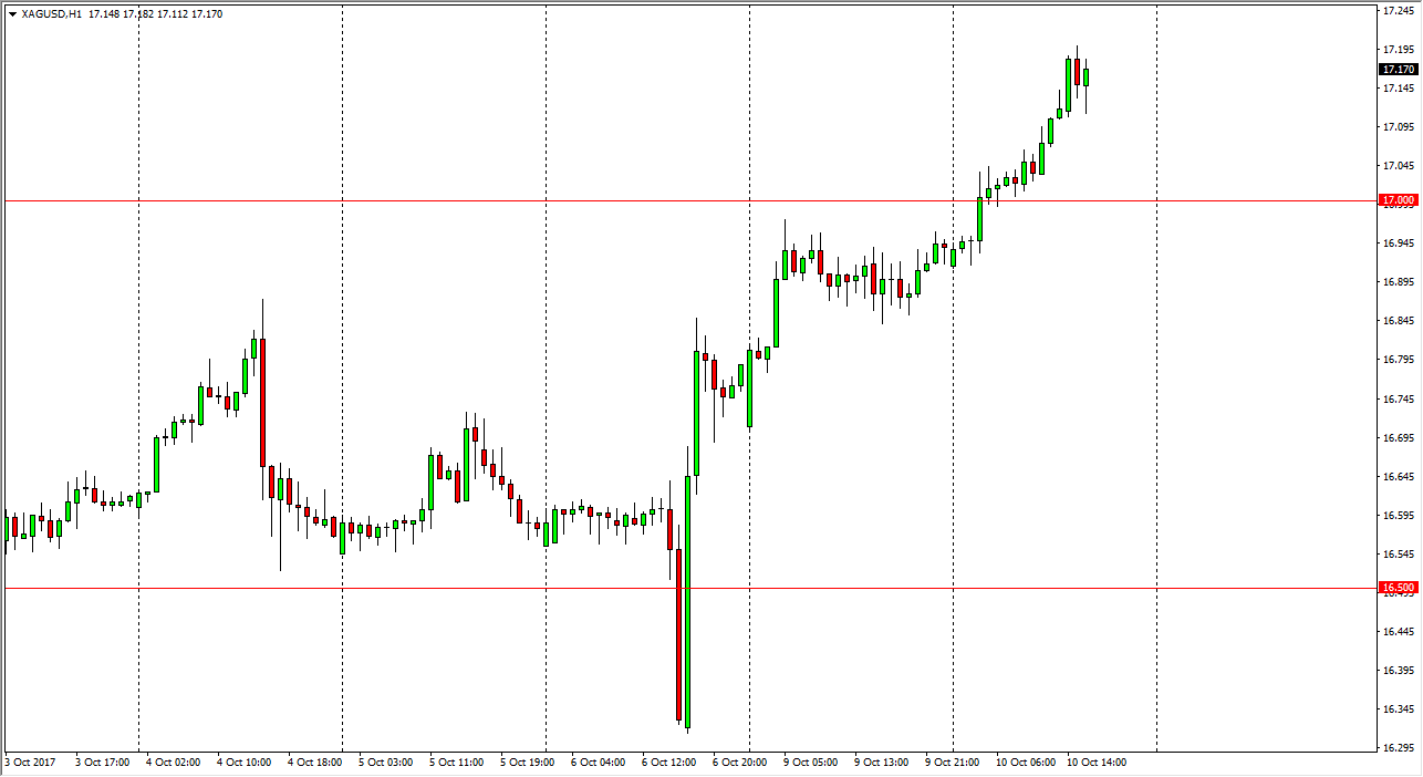 Silver markets broke out during the day on Tuesday, clearing the $17 level. This of course is a certain amount of resistance that has been overcome, and