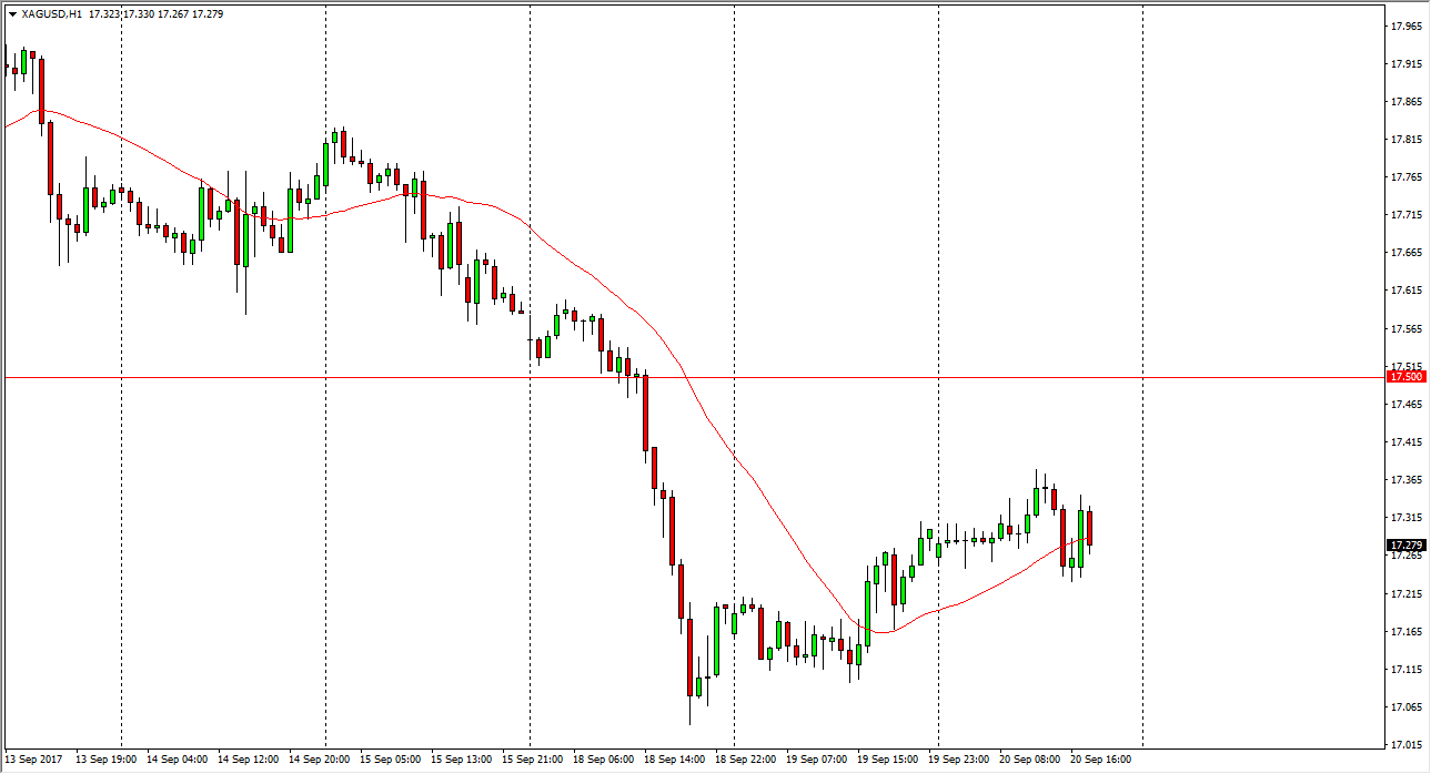 Silver markets went sideways initially during the session on Wednesday, as we continue to wait for the Federal Reserve’s next actions. Quite frankly, I believe that the $17.50 level above is going to be resistance. But if we can break above there, then the market should go towards the $18 level. I think that we will see a significant amount of support just below, especially near the $17 level. That is an area that should be supportive, based upon longer-term charts. That being said, unless the Federal Reserve raises interest rates, which is all but impossible at this point due to the hurricanes, it’s likely that we will continue to see a general uptrend over the next several sessions and silver. I think at this point though, we are essentially consolidating between the $17 level on the bottom and the $17.50 level on the top.