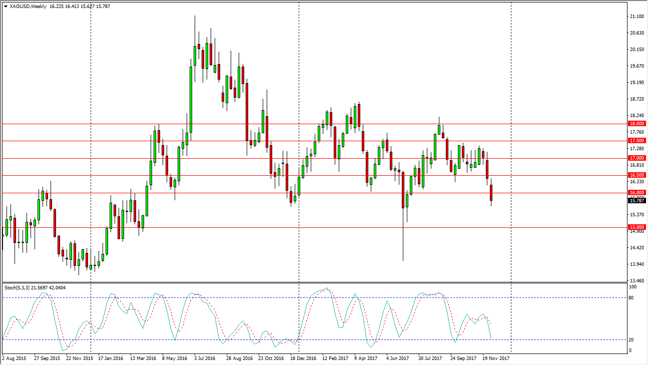 Silver markets gapped lower initially during the week, turned around to fill that gap and then continue to fall.