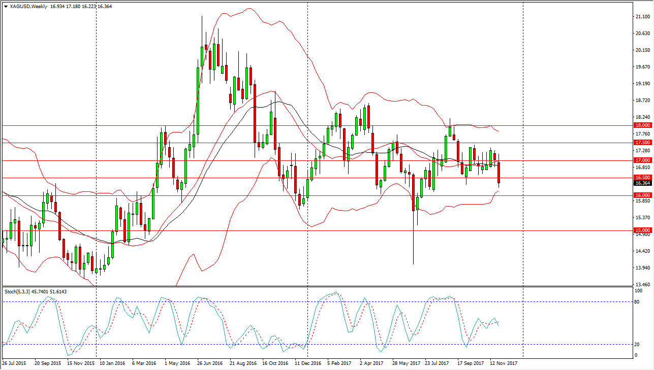 Although it does look a little bit bearish after this past week, longer-term, I see nothing on this chart that tells me that we are getting out of the overall range, between the $16 level on the extreme bottom, and the $18 level on the top. Until something changes fundamentally, I believe Silver continues to be very choppy and range bound, so therefore it’s difficult to imagine a scenario where I would be willing to hang onto a trade for too long, so I think longer-term traders are going to continue to favor the buying and holding onto physical silver, not necessarily leveraged markets.