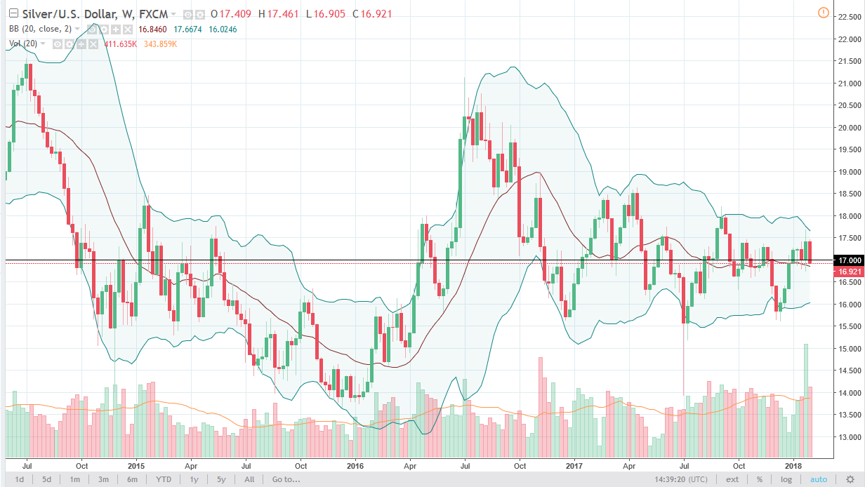 Silver markets look to be bearish by the end of the week, after the jobs number came out of the United States. Ultimately, I think that this market will probably continue to bounce around the $17 level, looking for a reason to move to the upside. We are starting to tighten up in general, so that of course will keep this market on the sideways direction. If we can break above the $17.50 level, the market should then go towards the $18.50 level, and a break above there should send this market to the $20 level.