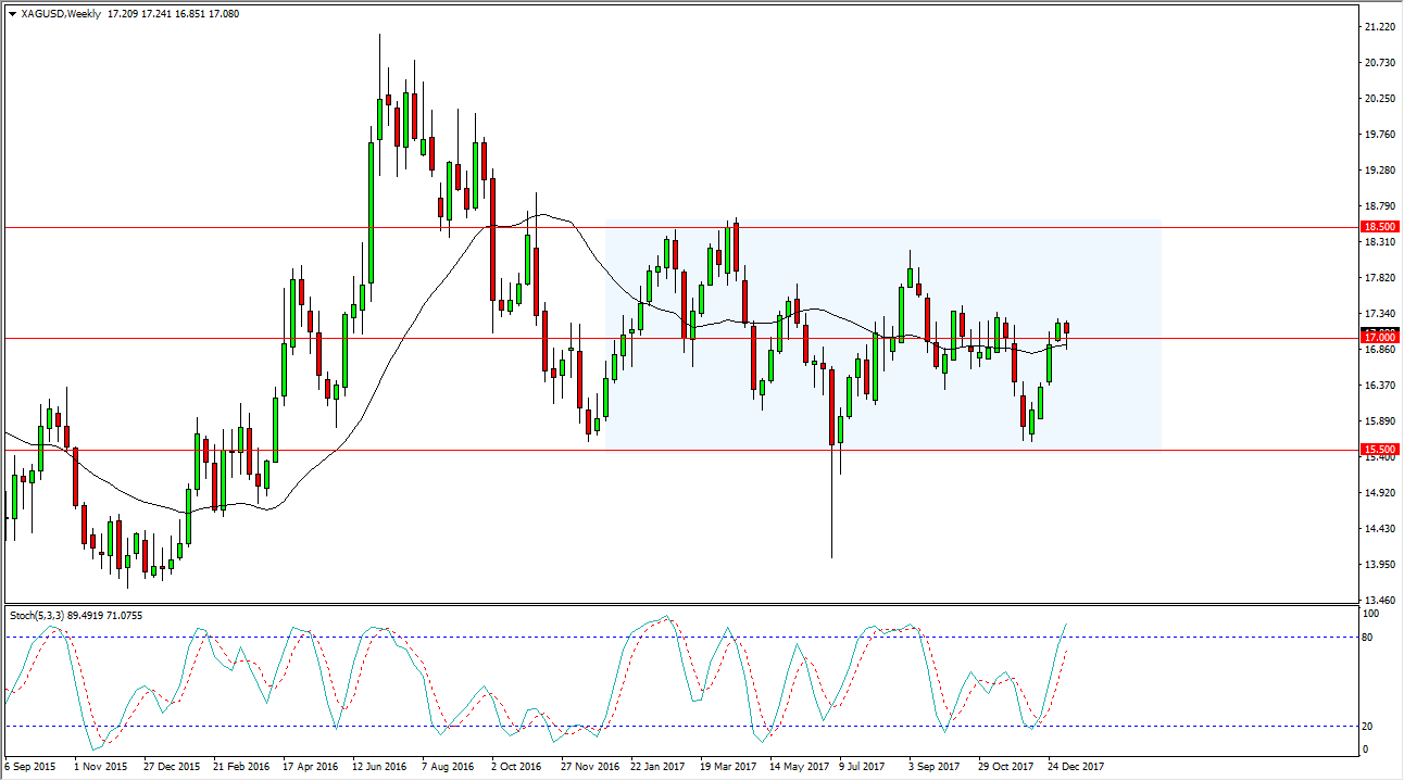 Silver markets initially dipped during the week, but on Friday, we rallied significantly and broke above the $17 level. The resulting candle is very bullish.