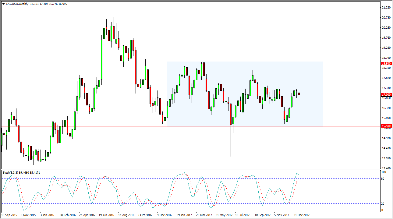 When you look at the overall consolidation, it extends up to the $18.50 level, and down to the $15.50 level. This is a market that I think continues to be very choppy overall, and I would not be putting money to work until we get a breakout from the range of the week. If we can break above or below the blue box on the chart, that would be a very bullish sign, or negative depending on where we go. At that point, you could become a lot more aggressive. What I would point out is that the stochastic oscillator is a bit overbought, so it is possible that we will see a pullback. Nonetheless, I think that Silver continues to be a very choppy market to deal with, and I prefer to trade silver with physical metal, or at least CFD market so that I don’t have the risk inherent in the futures market which can be a bit expensive.