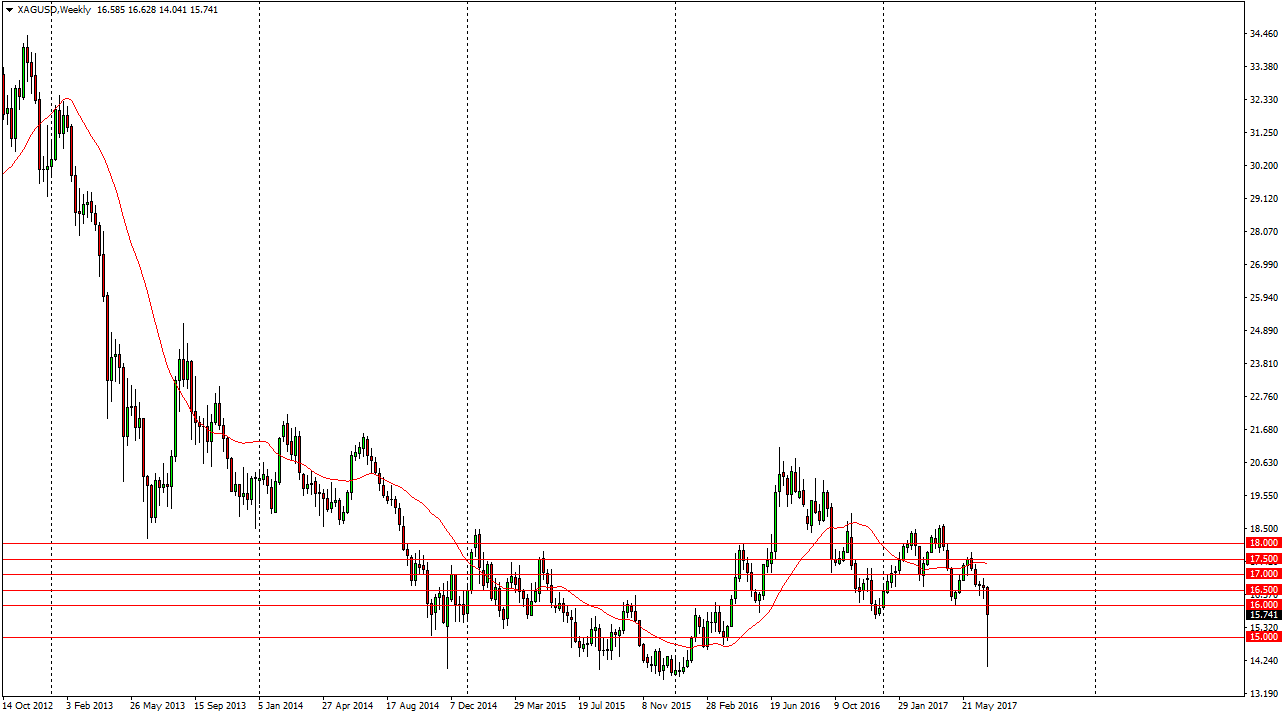 I believe the selling rallies continue to be the best way to trade this market, and it may even be off shorter-term charts that you find the easiest way to go forward. Silver markets have no real support in them below the $15 level that I would be overly interested in, except for maybe the $10 level which is supportive on ultra long charts. Ultimately, this is a market that I think will continue to suffer unless there is some type of massive surprise in the form of geopolitical concerns. At that point, we may have people buying precious metals for safety, but other than that I don’t see a scenario where the buyers will take over again. The market looks very ominous to say the least. Physical silver could be bought, but quite frankly that’s about as good as it gets.