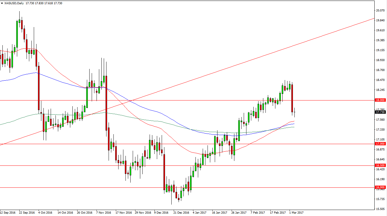 Silver markets pulled back slightly on Friday again, but what I find interesting is that the 50-day exponential moving average sits just below. That tends to be a very influential moving average for longer-term traders. With even more interesting is that we have recently crossed above the 100-day exponential moving average and the 200-day exponential moving average as well. Since all 3 of these moving averages have crossed, I believe that a lot of longer-term traders are starting to get involved. Having said that, the fall on Thursday was rather precipitous so I believe that we are finally making the decision as to whether the longer-term trend is going to continue to go to the upside. If we can break above the top of the candle for the Friday session, I believe that the $18 level will be targeted and then eventually we should go higher than that.