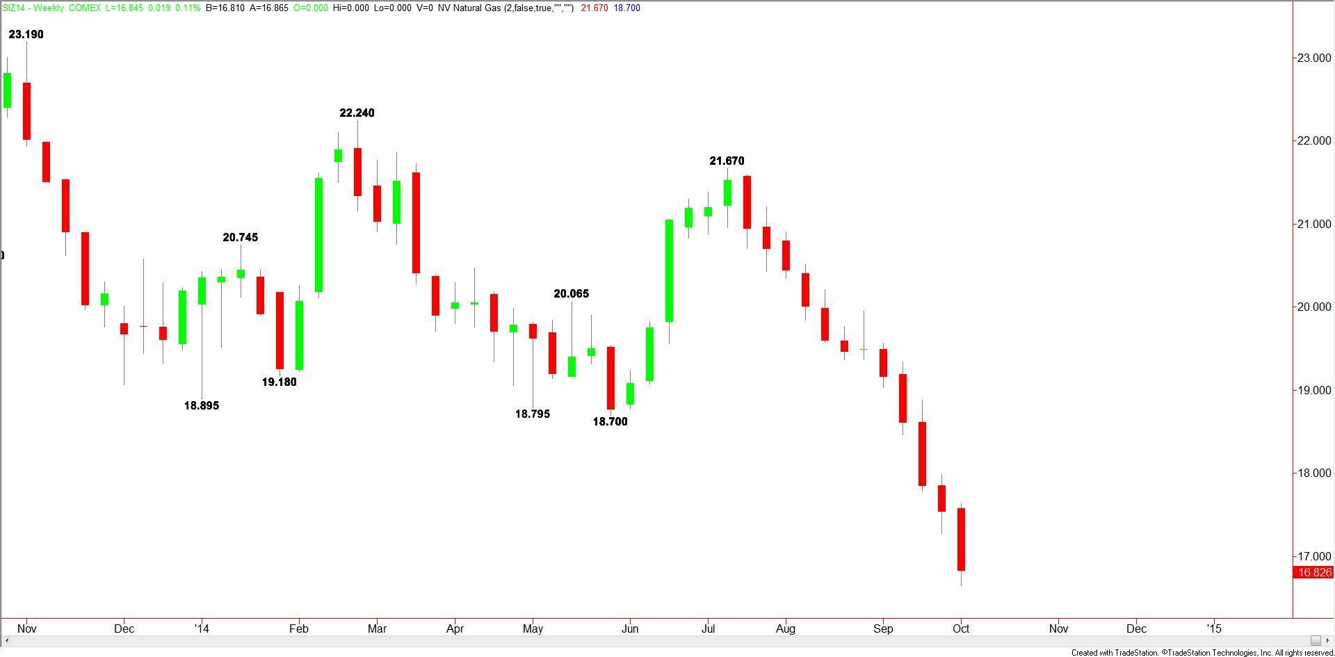 December Comex Silver prices plunged last week to its lowest level since February 2010. The momentum on the close suggests traders may go after the 2010 bottom at $15.82.