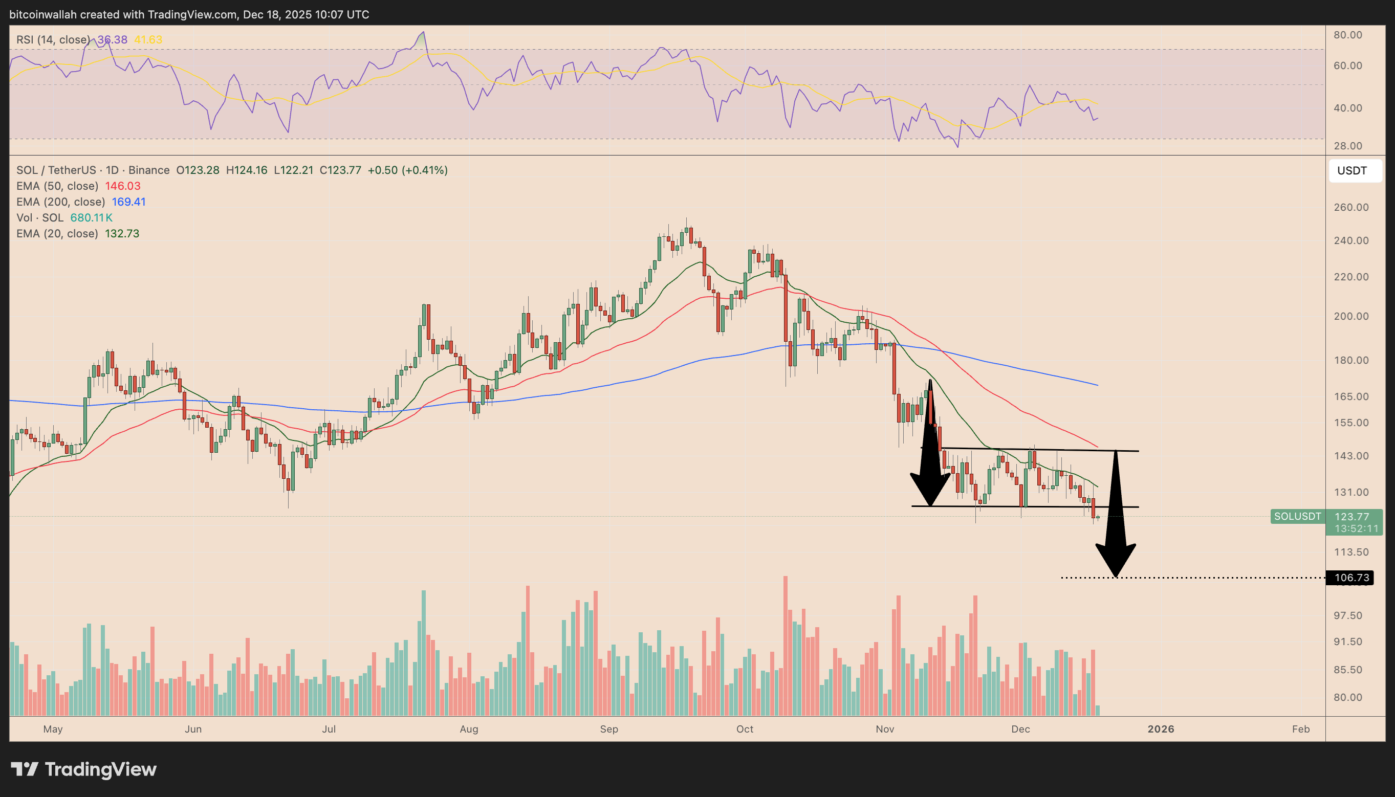 Solana is flashing a bearish continuation signal after entering the breakdown phase of a well-defined bear flag pattern on its daily chart.