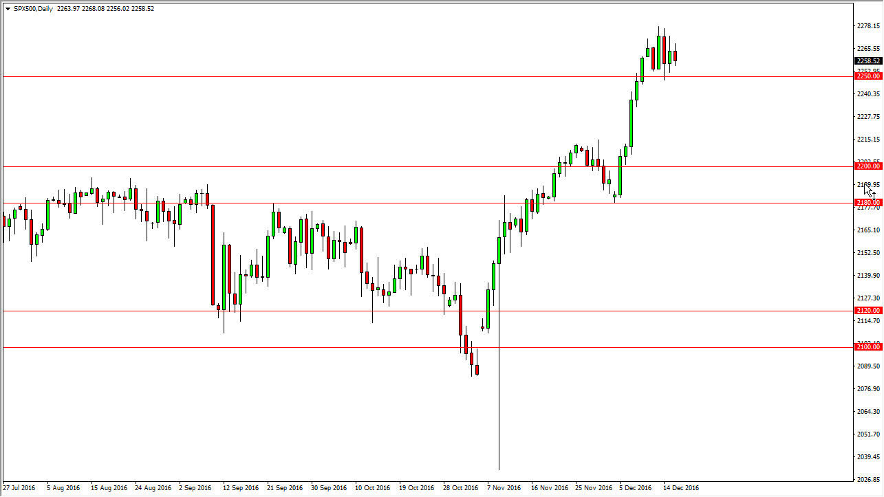 The S&P 500 formed a slightly negative candle on Friday, but it appears more than likely we are going to continue to go sideways in general. If we can break down below the 2250 level, the market will more than likely find support somewhere between here and 2200. If we break above the 2275 level, the market should continue to go much higher, perhaps reaching towards the 2300 level, and then the 2350 level. Ultimately, I have no interest whatsoever in selling this market, but do recognize that we are a bit extended at this point.