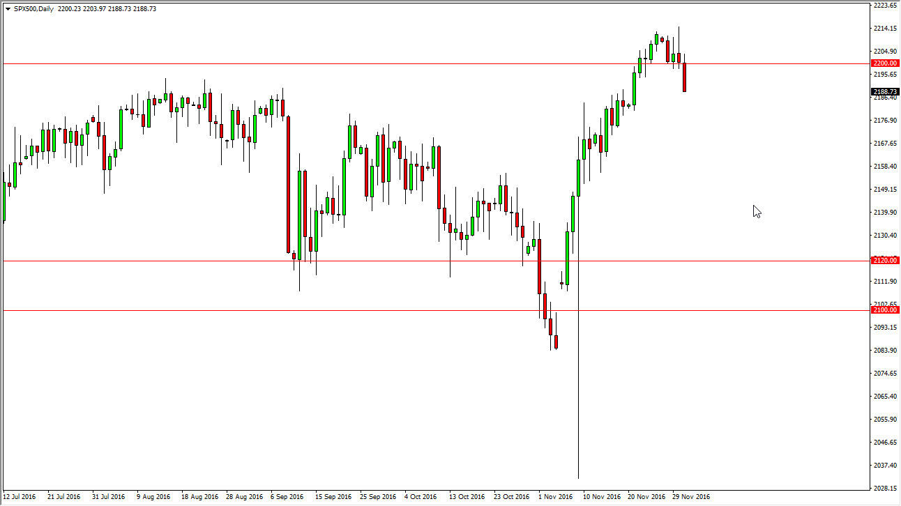 The S&P 500 fell on Thursday, slicing through the 2200 level. The 2180 level below is supportive though, so sooner or later I think the buyers will return. This will be especially true if the jobs number today comes out better than expected, which is currently anticipated to be an addition of 175,000 jobs for the month of November. Ultimately, there is plenty of support below and choppiness on way to the 2150 handle, so therefore I don’t really have any interest in selling but I do recognize that it could be a bit difficult for the next several sessions.