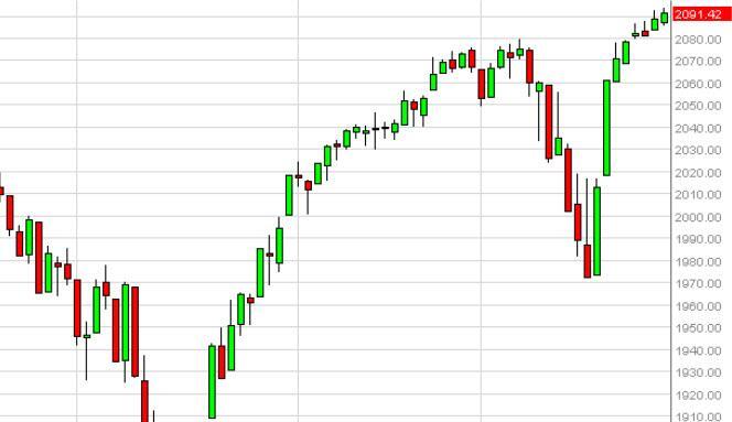 The S&P 500 rose slightly during the session on Monday, as we continue to try to climb higher. The 2100 level looms large as far as resistance is concerned though, so we think that any pullback at this point in time is simply going to be a momentum building exercise. With that, we are looking for short-term pullbacks in order to continue going long, as the supportive candles on short-term charts would be reason enough to start going long. We have no interest in selling, because the S&P 500 is so bullish.