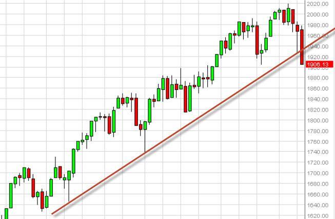 The S&P 500 initially tried to rally during the course of the week, but found the 1980 level to be far too resistive. With that, we ended up falling rather significantly, closing at the 1906 level. With that, we are starting to test the 1900 support barrier, as well as the uptrend line that the market has been working against. The fact that we broke down below the bottom of a weekly hammer from the previous week of course is a very negative sign, and it must be said that global markets in general a very vulnerable. With that, it does not surprise us at all if this market closes on a daily close below the 1900 level, which is reason enough for us to start selling.