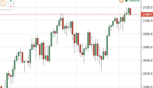 The S&P 500 fell during the day on Thursday, as the 2120 level offered far too much in the way of resistance. By doing so, it looks as if we are going to test the 2100 level for support. There should be plenty support there though, so this point in time I believe it’s only a matter of time before buyers jump back into this marketplace and start pushing to the upside. I have no understand selling, and do believe that it’s only a matter of time before we break out and continue the longer move higher.