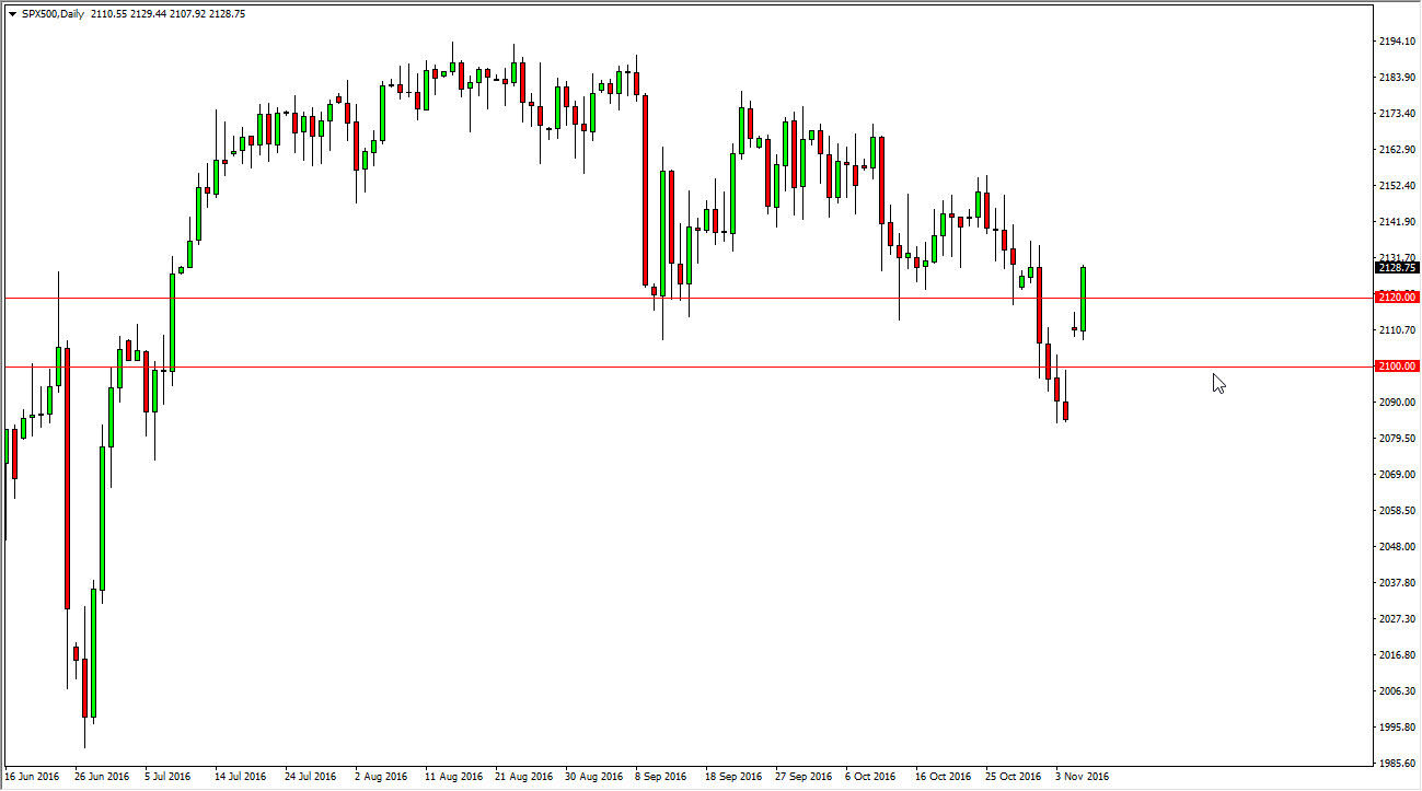 The S&P 500 gapped higher at the open on Monday, as we were than Hillary Clinton was not going to be charged with a crime based upon the email server. Because of this, the market looks as if the buyers have stepped back in, but we have the election today, and it’s very likely that the markets will be quiet. We will not get the announcement until after the trading day is over, so my best move is to be on the sidelines and simply wait to see what happens next as the election is still very tight.