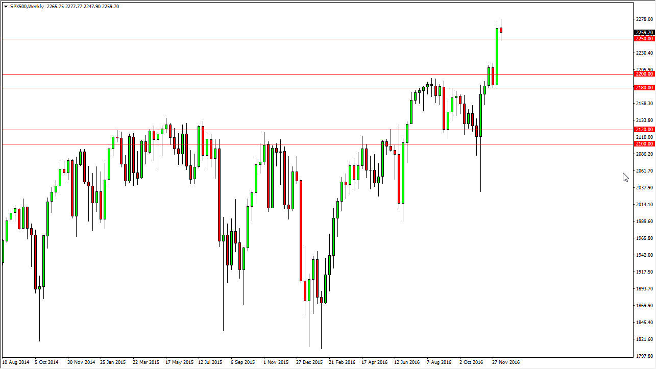 The S&P 500 went back and forth during the week, testing the 2250 level for support. This is a market that shows a little bit of exhaustion now, so we