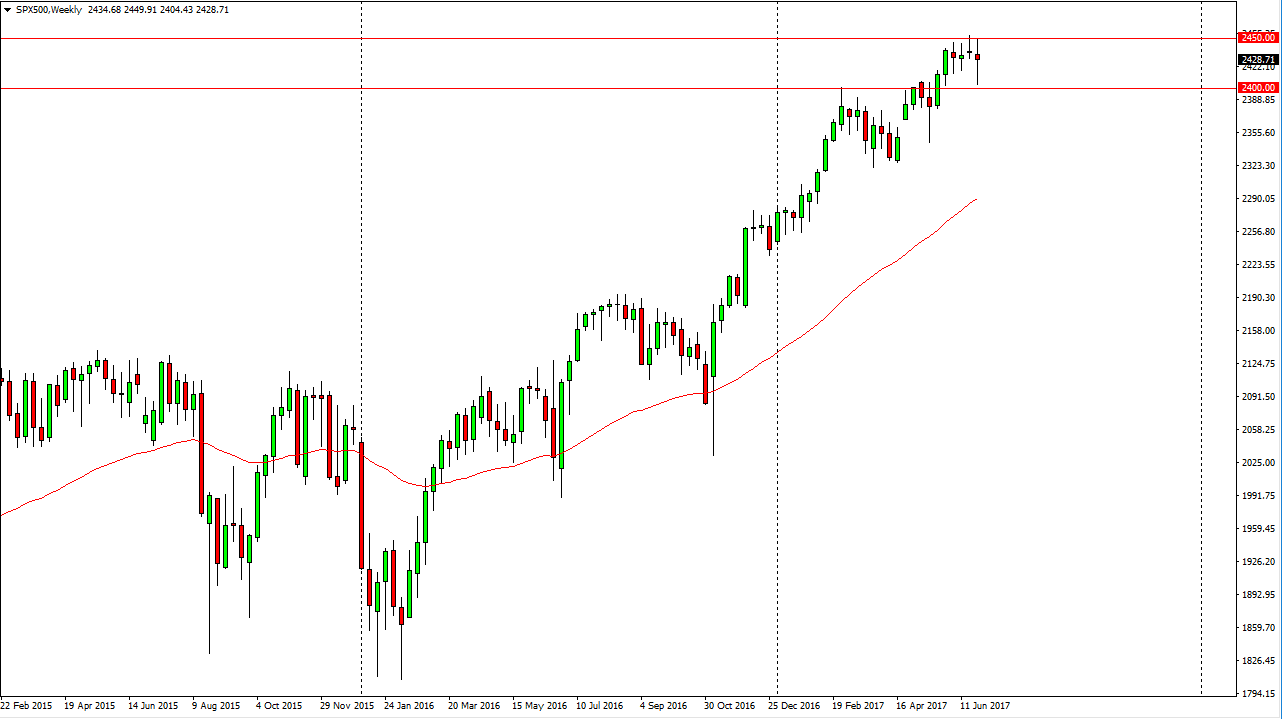 The S&P 500 went back and forth during the week, testing the 2400 level underneath. That’s an area that was previously resistive, and the area below