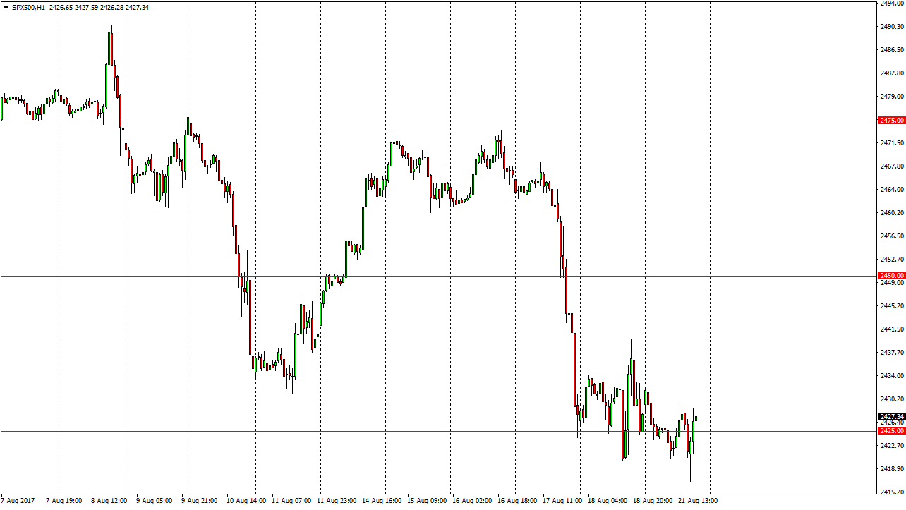 The S&P 500 has been choppy during the Monday session, but seems to be finding a bit of support at the 2425 region. If we can break above the trading