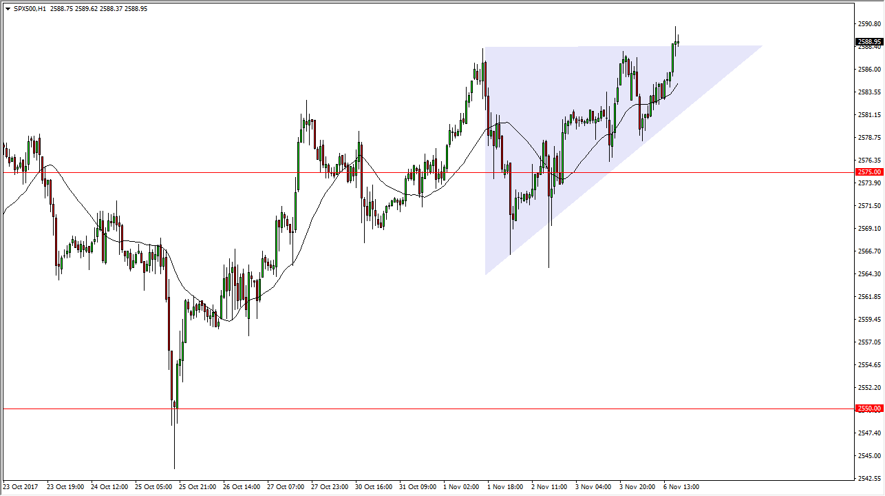 The S&P 500 has rallied yet again during the session on Monday, breaking to a fresh, new high. It looks like we are trying to get above the 2600 level eventually, and a move above that should send this market even higher. However, I think that pullbacks will be buying opportunities, and that’s probably what we will see in the meantime as it will take a significant amount of momentum building to break out. I look to buy on the dips, and it certainly looks as if we will get those opportunities below. The 24-hour exponential moving average is turning higher, showing that we continue to find reasons to go long. The pseudo-ascending triangle that I have drawn on the chart also suggests that we are going to see a move to roughly 2615, and I think that given enough time it’s likely that the algorithmic traders continue to come back into the market and pick up the S&P 500 any time it sells off.