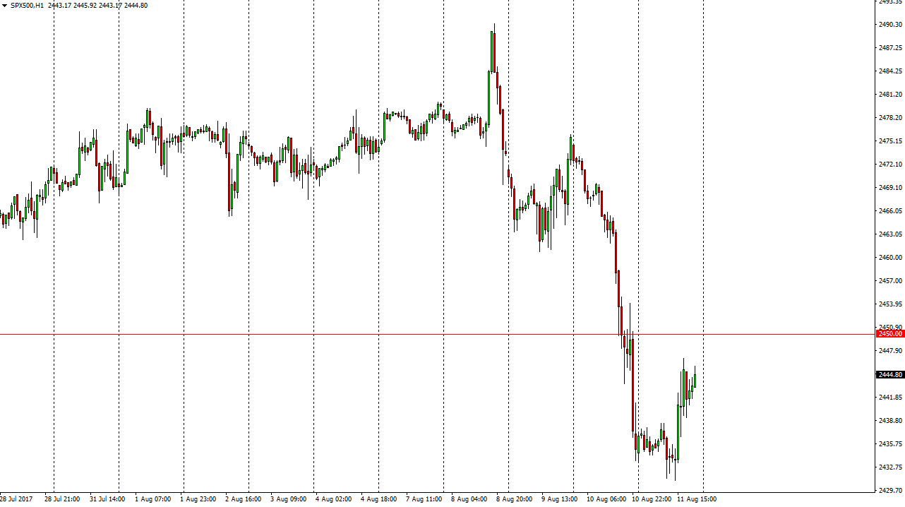 I believe that the market at 2400 as a massive bullish and supportive level. If we break down below there, I think that the market will fall apart. In the meantime, I look at these pullbacks as value and realize that clearing the 2450 level would be a sign of strength. If we did breakdown below the 2400 level, then the market would fall apart and I would become a massively short traitor. Ultimately, this is a market that will be paying attention to what’s going on between the United States and North Korea, and that of course will continue to be one of the main drivers of what happens next. For what it’s worth, we have seen a bounce from an uptrend line on the short-term charts, so I think that the buyers are about to return. However, caution is necessary as we have seen recently.