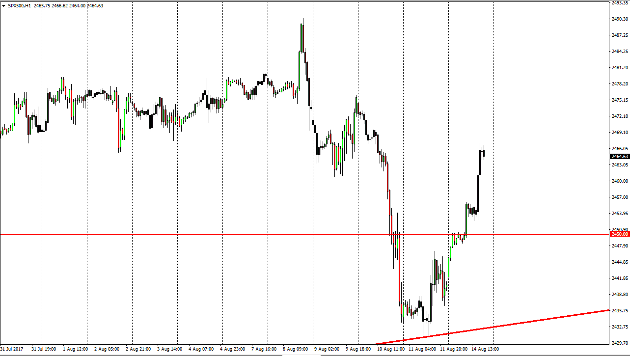 The S&P 500 gapped higher at the open on Monday and then shot through the 2450 level. The market looks likely to have a slight pull back, but I