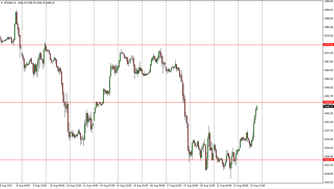 The S&P 500 initially rose during the day and then pulled back on Tuesday. There was a report coming out that perhaps there is some possible progress made in tax reform in the United States, and this at the S&P 500 to the upside. The 2450 level above continues to be resistive, and I think that the market could run into a bit of trouble here. A break above 2450 should send this market to the 2470 level, and then perhaps 2475. However, I suspect that there could be a bit of a pullback from here, so be aware of that. Small position sizing will probably continue to be a necessity.