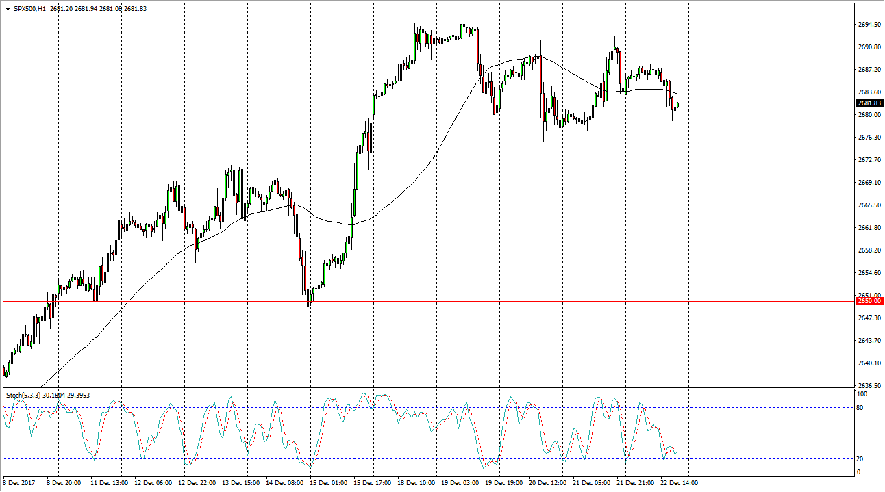 The S&P 500 went sideways during Friday, and then drifted a bit lower to reach down towards the 2680 handle. This is a market that had almost no volume as traders were interested in Christmas, not trading. Longer-term, this is a market that has been very bullish, and I think that we will eventually see the buyers get into this market. Ultimately, I think that the next couple of sessions could be rather soft, as we have a serious lack of volume between now and New Year’s Day. However, I think once we get through the holidays there will be plenty of reasons to get involved, as the tax reform has given us a bit of a turbo boost for corporate proffers. The 2650 level underneath is the “floor” in the market, and I don’t think that we break down below there. I do believe that there will be plenty of value hunters underneath, and ultimately this market should reach towards the 2700 level again.