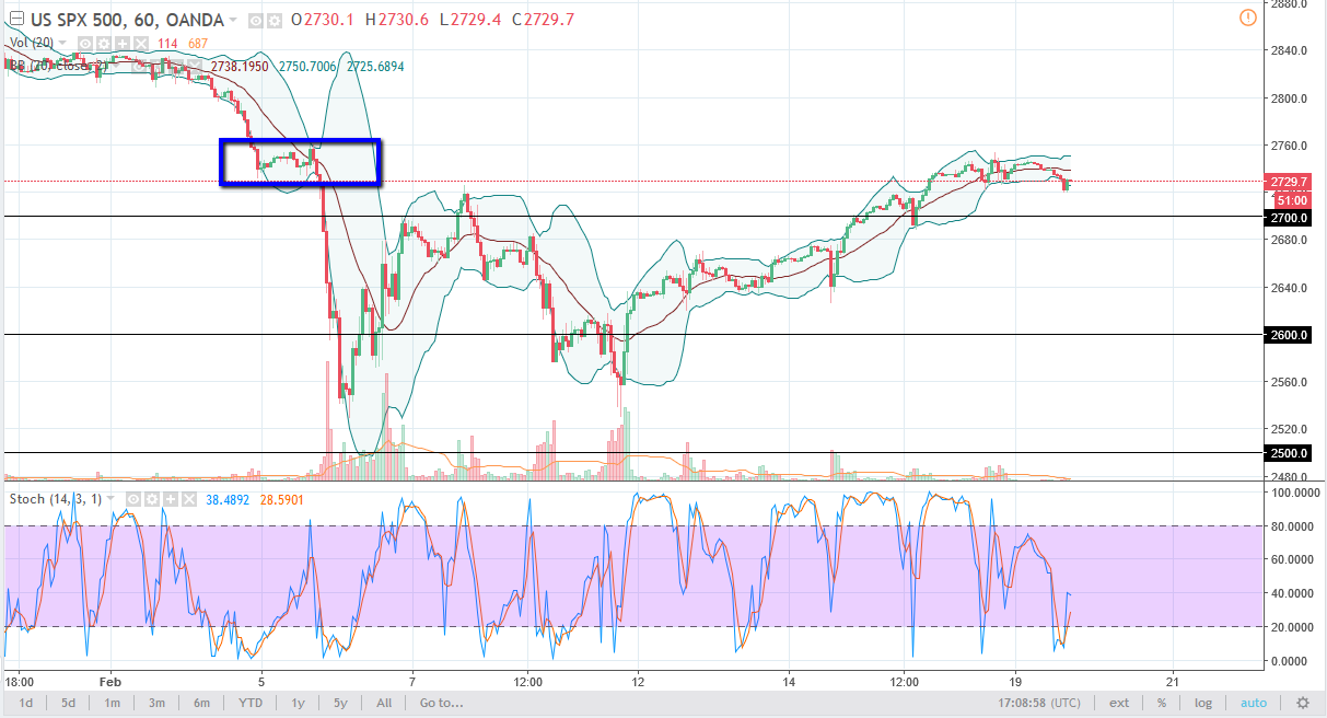 The S&P 500 drifted a little bit lower during the trading session on Monday, as we continue to see the market bounce around the 2725 region. The 2700 level underneath is very supportive though, and I think this could end up being an opportunity. On the other side of the equation, there is a lot of noise just above that could come into play. However, remember this was electronic trading in the futures market and the CFD market that came into play more than anything else. Actual underlying trading was closed for Presidents’ Day.